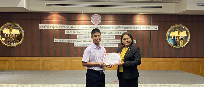 ขอแสดงความยินดีกับ นายธงรบ พุ่มเจริญ นักเรียนชั้นมัธยมศึกษาปีที่ 4 โรงเรียนฉะเชิงเทราปัญญานุกูล จังหวัดฉะเชิงเทรา ผ่านการคัดเลือกเยาวชนพิการไทยที่มีความรู้ความสามารถด้านเทคโนโลยีสารสนเทศ เป็นตัวแทนของประเทศไทยเข้าร่วมการแข่งขันความท้าทายทางเทคโนโลยีสารสนเทศระดับสากล ประจำปี 2567 (2024 Global IT Challenge for Youth with Disabilities) ที่จะจัดขึ้นระหว่างวันที่ 14 – 19 ตุลาคม 2567 ณ สาธารณรัฐฟิลิปปินส์