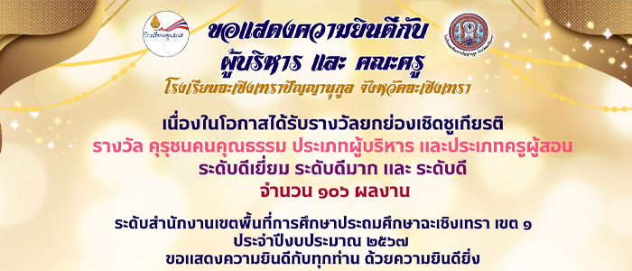 โรงเรียนฉะเชิงเทราปัญญานุกูล จังหวัดฉะเชิงเทรา ขอแสดงความยินดีกับ ผู้บริหาร คณะครู และบุคลากรทางการศึกษา ของโรงฉะเชิงเทราปัญญานุกูล เนื่องในโอกาสได้รับรางวัลยกย่องเชิดชูเกียรติ รางวัล คุรุชนคนคุณธรรม ประเภทผู้บริหาร และประเภทครูผู้สอน ระดับดีเยี่ยม ระดับดีมาก และ ระดับดี
