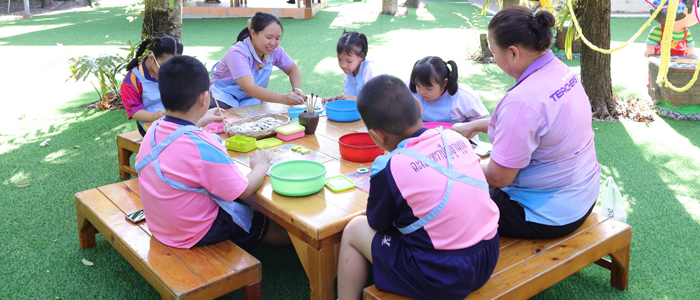 การจัดการเรียนการสอนนอกชั้นเรียนของครูและนักเรียนโรงเรียนฉะเชิงเทราปัญญานุกูล กับบรรยากาศร่มรื่น เย็นสบาย พื้นที่ปลอดโปร่ง ท่ามกลางต้นไม้ ณ ลานกิจกรรมสวน SG โรงเรียนฉะเชิงเทราปัญญานุกูล