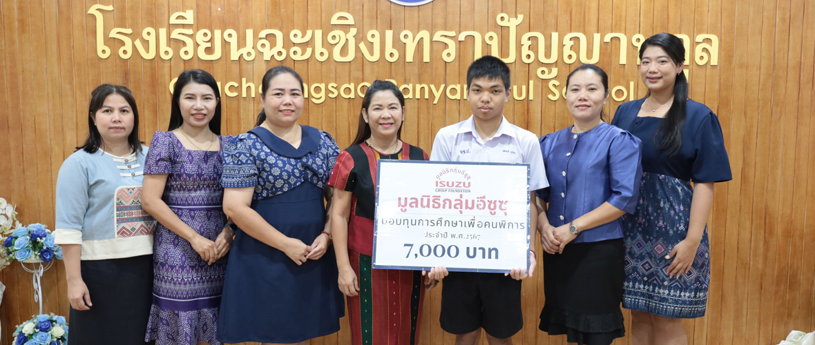 วันศุกร์ ที่ 21 พฤศจิกายน พ.ศ. 2567 โรงเรียนฉะเชิงเทราปัญญานุกูล จังหวัดฉะเชิงเทรา นำโดย ท่านผู้อำนวยการ รองผู้อำนวยการ และคณะครู ร่วมแสดงความยินดีกับ นายอดิศักดิ์ บุบไชยา นักเรียนชั้นมัธยมศึกษาปีที่ 6 ได้รับทุนการศึกษาอีซูซุเพื่อคนพิการ ประจำปี พ.ศ. 2567 จำนวน 7,000 บาท ของมูลนิธิกลุ่มอีซูซุ ISUZU GROUP FOUADATION
