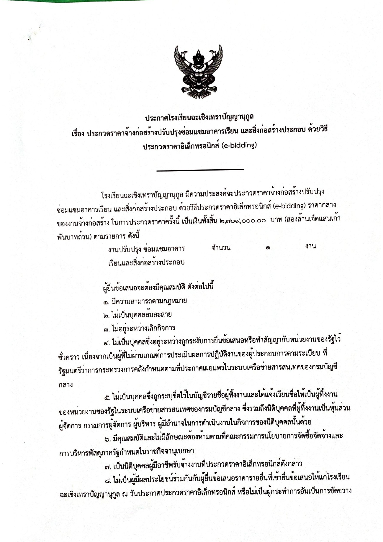 โรงเรียนฉะเชิงเทราปัญญานุกูล มีคามประสงค์ประกวดราคาจ้างก่อสร้างปรับปรุงซ่อมแซมอาคารเรียน อาคารประกอบ ด้วยวิธีประกวดราคาอิเล็กทรอนิกส์ (e-bidding) ราคากลางของงานจ้างก่อสร้าง ในการประกวดราคาครั้งนี้ 2,709,000.00 บาท (สองล้านเจ็ดแสนเก้าพันบาทถ้วน) ตามรายการดังนี้